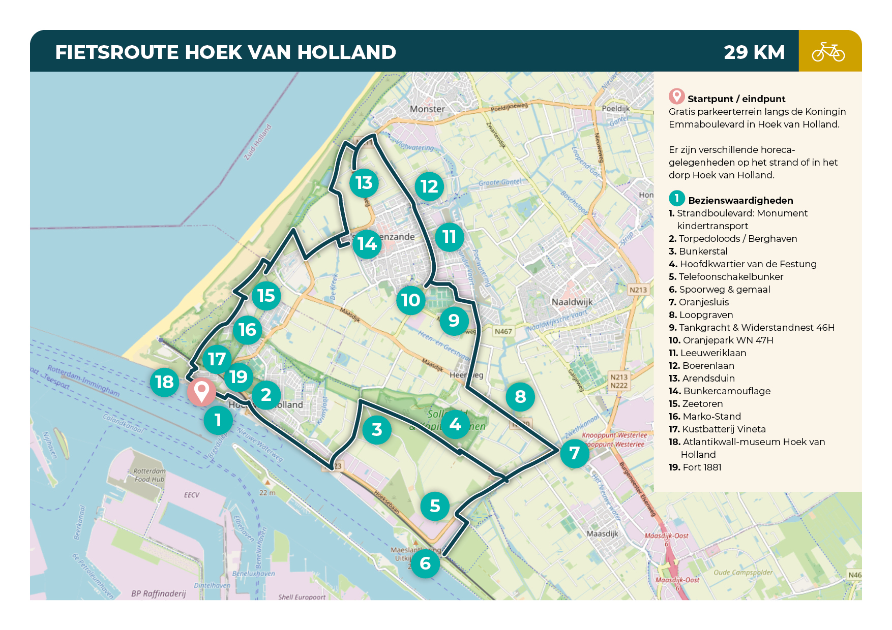 Op de noord- en zuidoever verrezen ruim duizend bunkers, de grootste concentratie Duitse bunkers in Nederland. Tegen een aanval door geallieerde luchtlandingstroepen vanuit het binnenland werd rond Hoek van Holland een metersdiepe dubbele tankgracht gegraven. Het gebied daarbinnen stond letterlijk vol met bunkercomplexen. De route volgt de contouren van het noordelijk deel van de Festung en begint aan de Koningin Emmaboulevard. Hier word je door een monument direct geconfronteerd met de dramatische gevolgen van oorlog. Via de Berghaven fiets je evenwijdig aan de Nieuwe Waterweg richting het Staelduinse bos waar de Duitsers een enorm hoofdkwartier bouwden. Daarna volg je het tracé van de buitenste tankgracht waar op regelmatige afstanden militaire steunpunten waren gebouwd. De gracht is bijna geheel gedempt en veel bunkers zijn gesloopt. Je ziet hoe de resterende exemplaren zijn geïntegreerd in de naoorlogse woningbouw. Bij de duinen aangekomen, volg je de kustlijn richting de Strandboulevard. Het overgebleven oorlogserfgoed concentreert zich naarmate je meer afstand aflegt. Bij de pier zie je een hoge tankmuur en een kanonkazemat waarin het Atlantikwall museum is gevestigd.