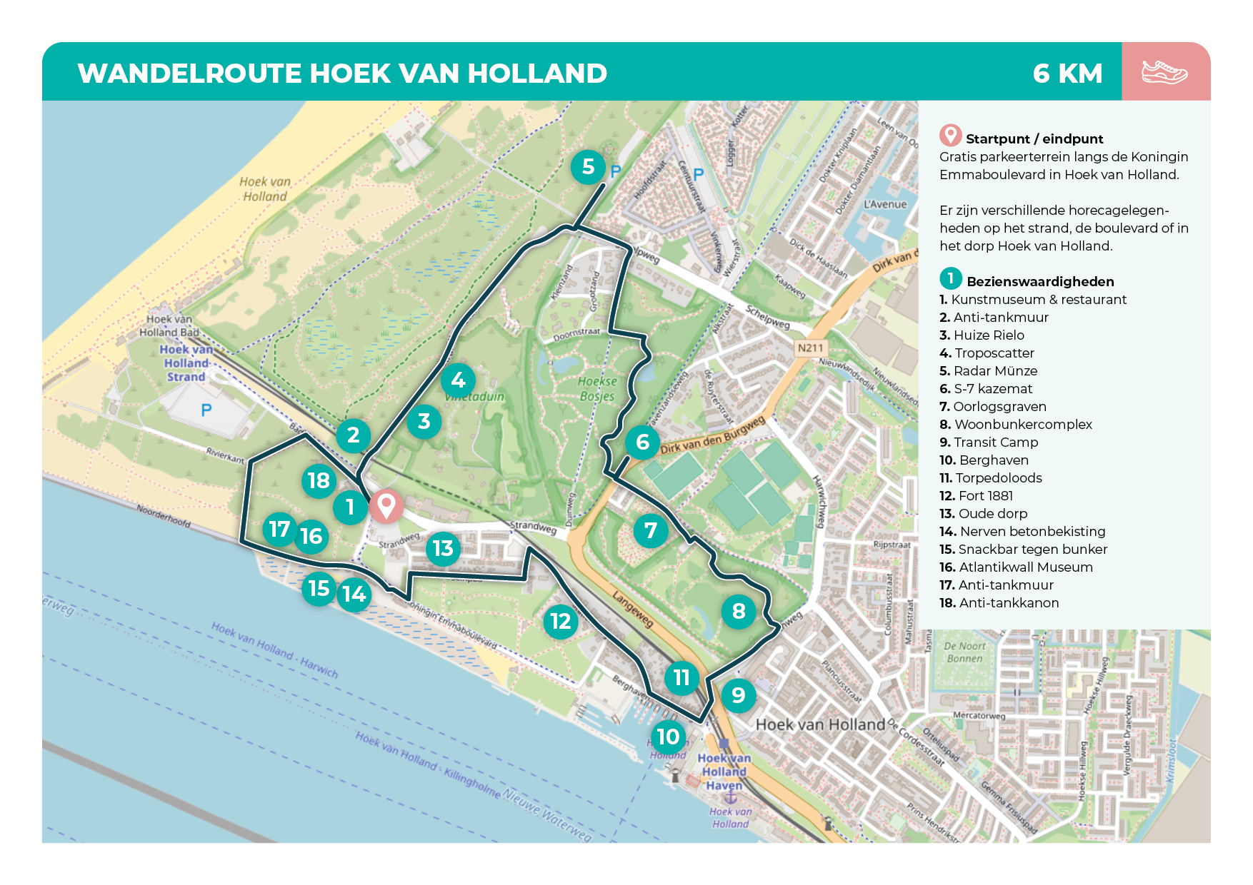 De Festung Hoek van Holland sloot de monding van de Nieuwe Waterweg af en daarmee de toegang tot de belangrijke havenstad Rotterdam. Hier kwamen scheepskonvooien vanuit Scandinavië binnen met onmisbaar ijzererts voor de Duitse oorlogsindustrie. Ook was het een thuisbasis voor de Duitse Kriegsmarine. Ter bescherming werden daarom tientallen bunkercomplexen gebouwd ten noorden en zuiden van de Nieuwe Waterweg. Na de oorlog zijn de zuidelijk gelegen complexen gesloopt vanwege de vergroting van het Rotterdamse havengebied. In en rond het dorp Hoek van Holland tref je echter nog volop tastbare herinneringen aan van de militaire geschiedenis. In willekeurige volgorde een bloemlezing: de diversiteit van de Duitse vestingbouw wordt zichtbaar langs de Nieuwe Waterweg en de Strandboulevard. Je doorkruist een luchtafweerstelling en volgt het tracé van een tankmuur, ziet in een duinrug een kustbatterij liggen en verderop een radartoren. Het Nederlandse Fort 1881 gebruikten de Duitsers als bakkerij en hospitaal. Engelandvaarders vertrokken vanuit de naastgelegen Berghaven. Slechts enkele vooroorlogse woonhuizen herinneren aan het oude dorp dat door de Duitsers werd geruimd voor vrij schootsveld. Ook kom je een vooroorlogse Nederlandse mitrailleurkazemat tegen en zie je een Amerikaanse troposcatter uit de Koude Oorlog.