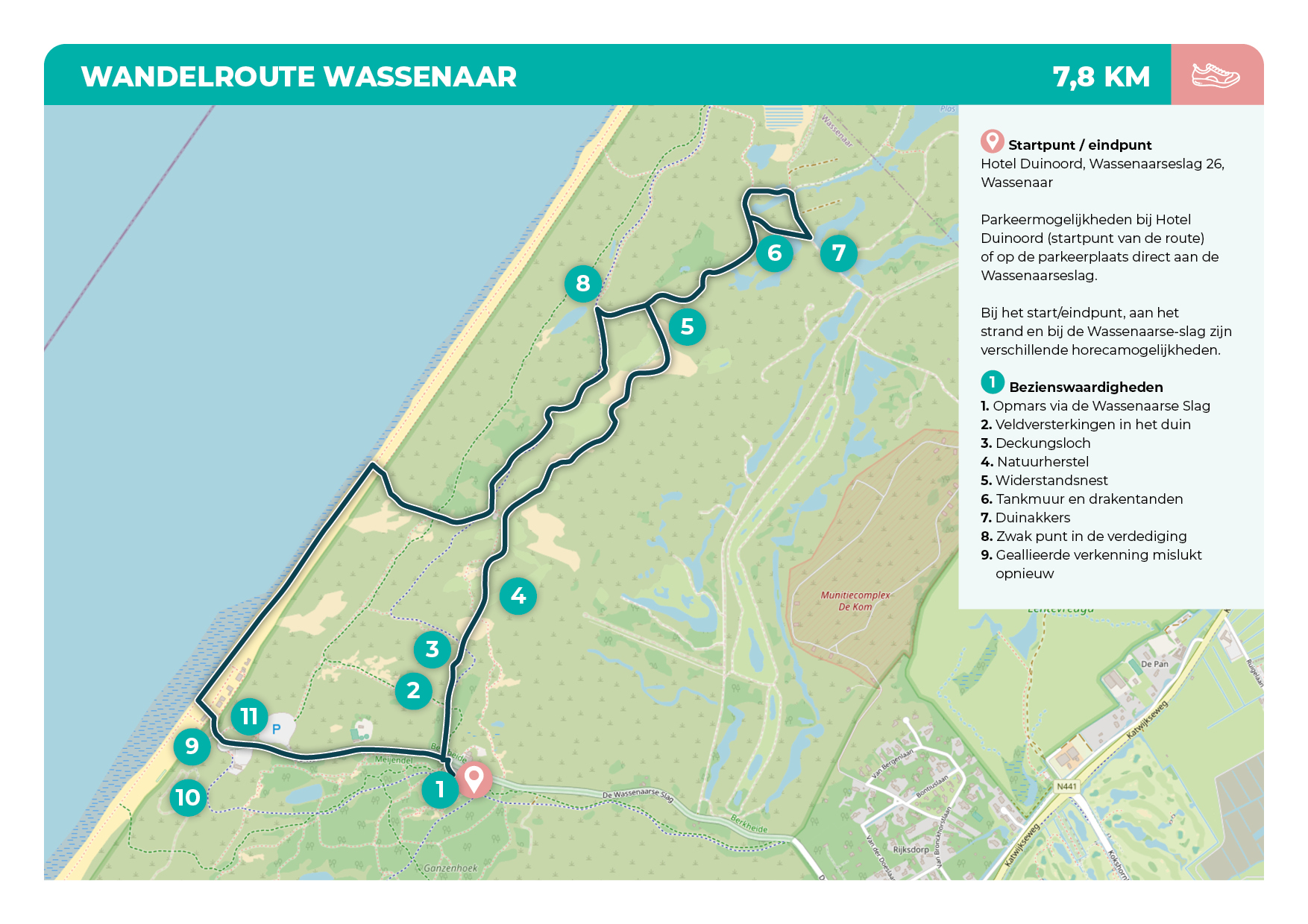 Vanaf Hotel Duinoord wandel je door een reliëfrijk duingebied dat tijdens de oorlog tussen de zwaarder verdedigde Stützpunktgruppen Katwijk en Scheveningen lag. Voor een efficiënte verdediging maakten de Duitsers hier vooral gebruik van het landschap zelf, aangevuld met verdedigingscomplexen en versperringen. Op hogere duinen lagen steunpunten waarvan je de sporen nog gedeeltelijk kan herkennen. Vanaf de eerste infanteriestelling ga je verder door een hersteld duingebied met bijzondere flora en fauna, infiltratieplassen en voormalige duinakkers. Erfgoed en natuur komen hier letterlijk samen. Onderweg passeer je meerdere Widerstandsnester. Veel zie je hier echter niet van, omdat de meeste verdedigingswerken onder zand of tussen begroeiing liggen. De lange tankmuur, onderdeel van het zuidelijke Landfront van de Stützpunktgruppe Katwijk, is echter niet te missen. Je kan over de muur lopen om een deel van het Landfront te verkennen en op zoek te gaan naar laars- en schoenafdrukken die de bezetter in het natte beton achterliet. Via strand en duin bereik je uiteindelijk de Wassenaarse Slag, waar een Duits infanteriesteunpunt met omvangrijk gangenstelsel is dat je kunt bezoeken. Hier ligt eveneens het monument ter nagedachtenis aan de Franse commando’s die in februari 1944 tijdens een geheime verkenningsmissie omkwamen.