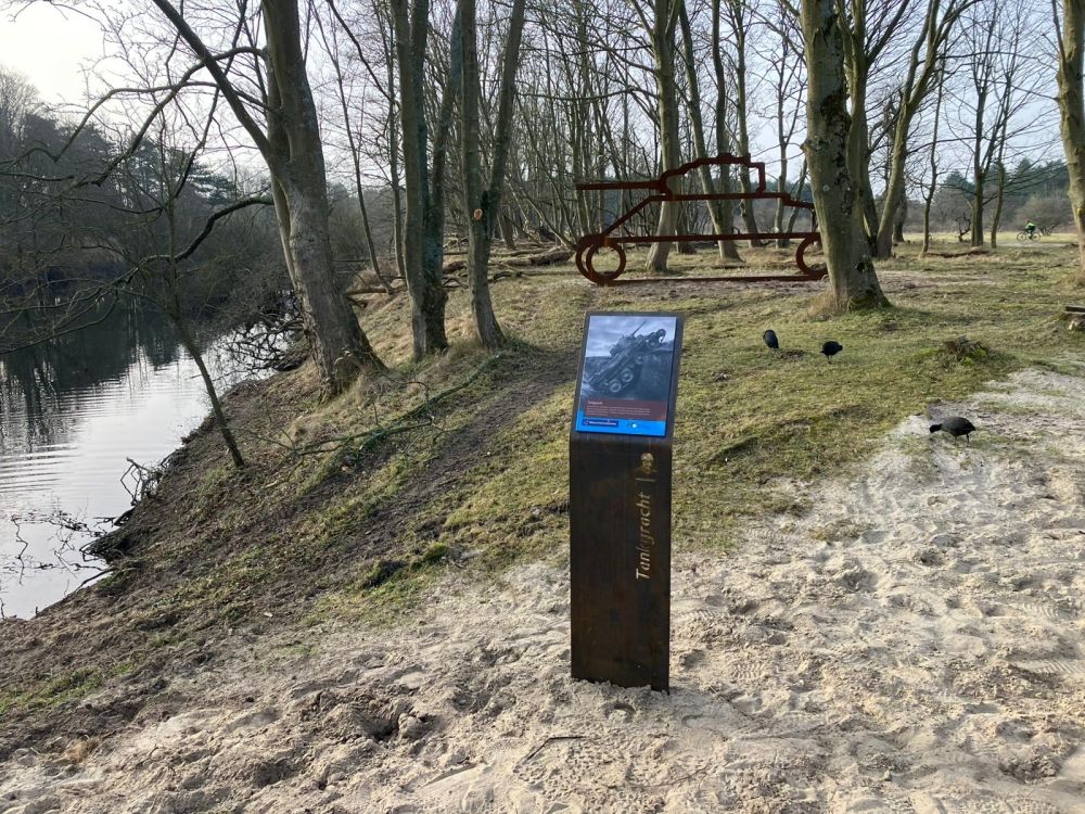 De groep vervolgde de route langs een tobruk en een replica van een schuilput, één van de speciaal ontwikkelde landschapskunstwerken, naar de tankgracht. Daar onthulde Annette Baerveldt, voorzitter van Nationaal Park Zuid-Kennemerland, een zes meter lange cortenstalen tank. Met deze symbolische handeling is de route officieel geopend.