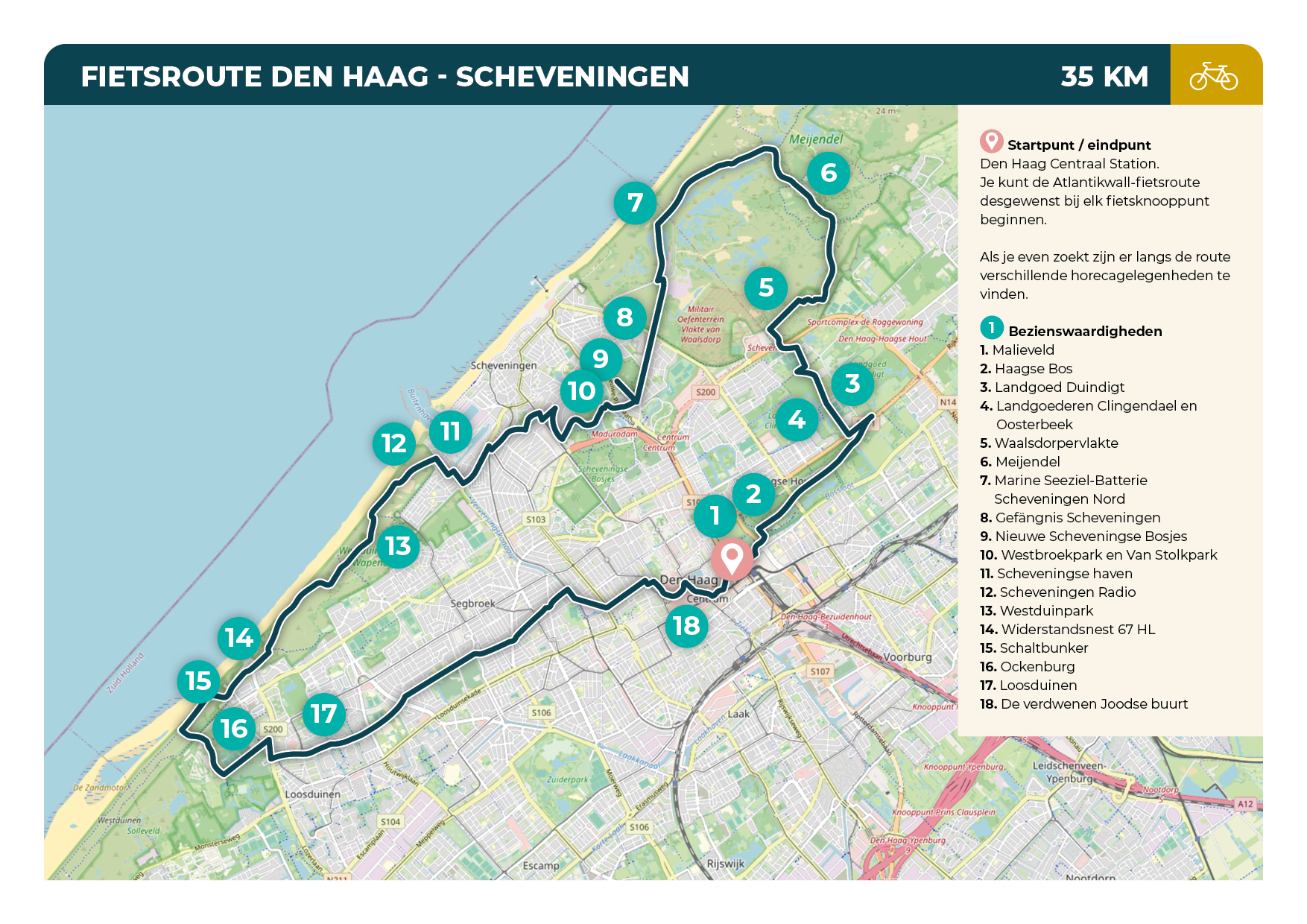 bunkercomplexen. In één ervan is een museum gevestigd. Vanaf de Scheveningse haven tot Kijkduin fiets je langs de kustlijn door een duingebied waar veel bunkers onder het zand liggen. Vanaf voormalig vliegveld Ockenburg, waar tijdens de meidagen hard is gevochten, fiets je terug via het Binnenhof en de destijds Joodse buurt. Hier herinneren monumenten aan een zwarte periode.