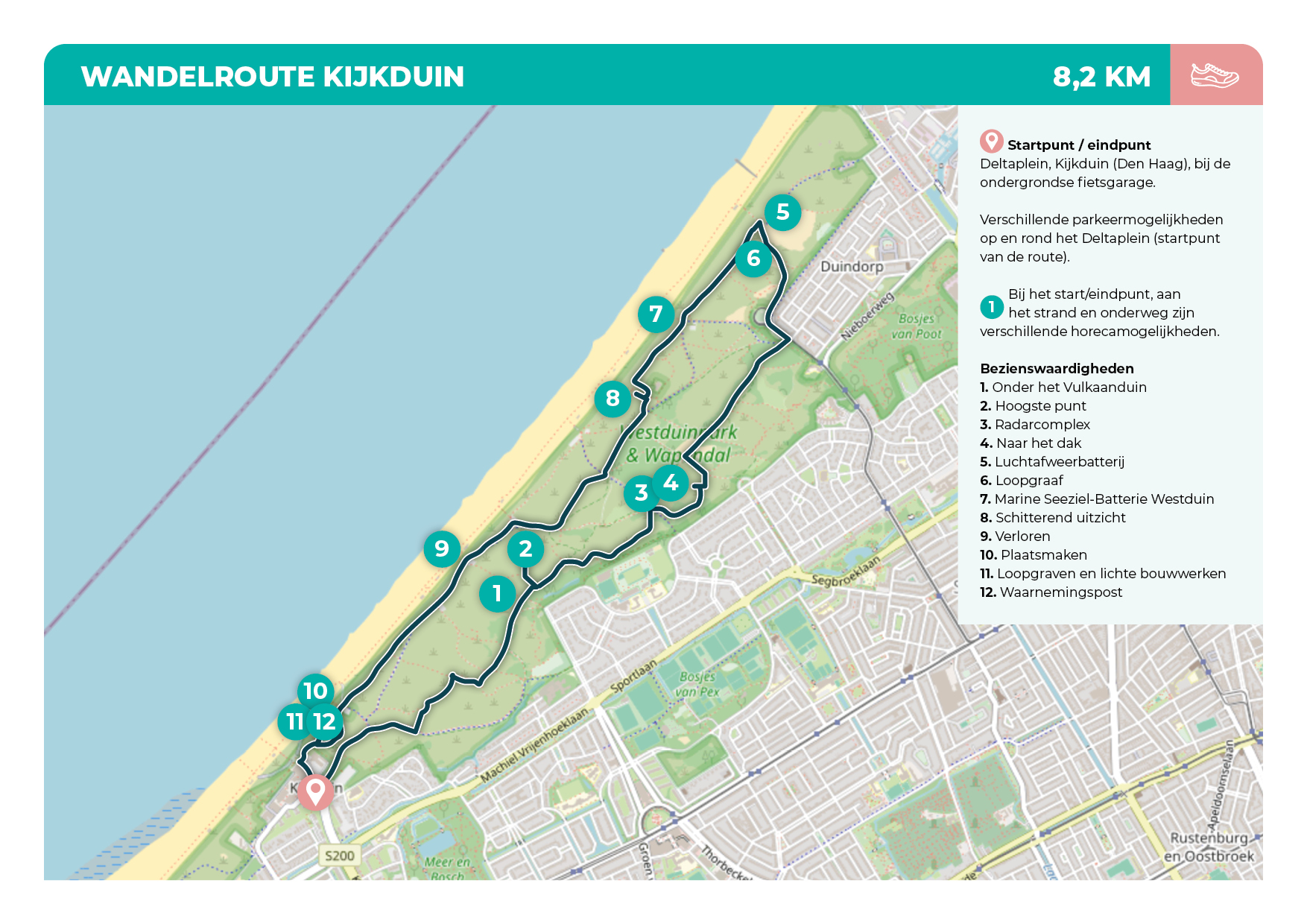 Deze wandelroute loopt door het Westduin en voert langs zichtbaar en onzichtbaar erfgoed van de Atlantikwall. Bijzonder zijn de vele hoge duintoppen en uitzichtpunten, waarvandaan de stellingen en verdedigingswerken goed te zien zijn. In enkele gevallen sta je zelfs bovenop een bunker.